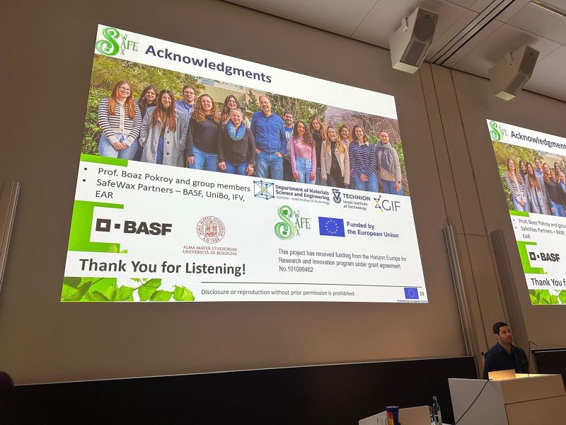Niv Ben-Arie, a PhD student, recently participated in the 18th International Symposium on Biomineralization (BIOMIN XVIII), held in Dresden, Germany. During the symposium, Niv delivered an oral presentation titled “Bio-inspired Superhydrophobic Coatings,” highlighting significant advances within the SafeWax project, including collaborative results with Alma Mater Studiorum, Università di Bologna and BASF.